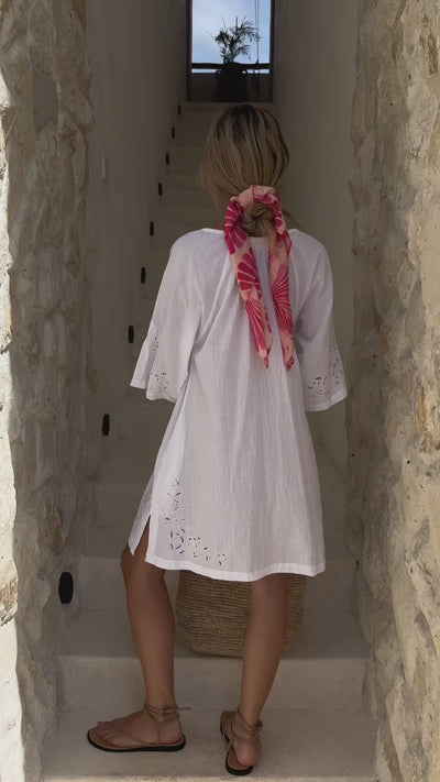 The most perfect beach coverup, sundress, morning walk along the ocean dress you ever did see! Her hand embroidered details, rope ties and effortlessly flowy shape will have you throwing her on every chance you get. Made in a cotton sand washed white, shes perfect with thongs, sandals or live out your barefoot dreams baby.
