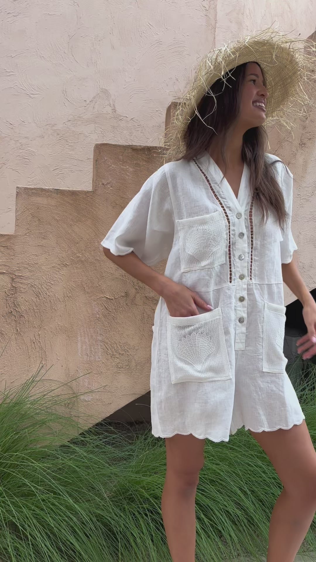 A vision of vintage inspired romance and effortless coastal chic. Our Bay Romper is adorned with hand embroidered cotton shells, a piece so special you'll hand her down to your daughters. We're in love with the relaxed fit, pockets for ocean treasures and scalloped edges. You'll never be comfier in something soooo stunning!
